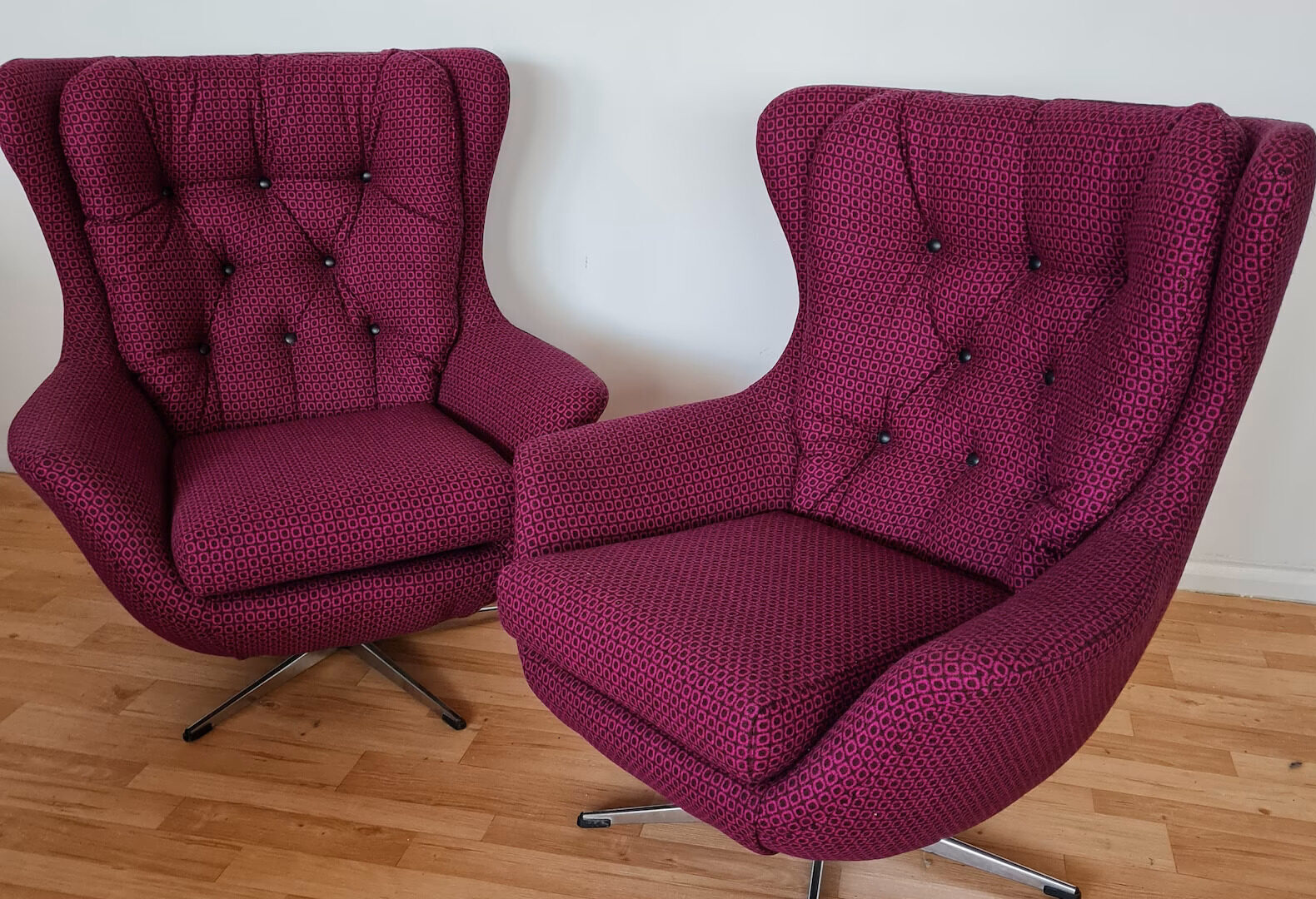This pair of Parker Knoll style chairs have been given the full Designer Workshop treatment and we decided to reupholster them in Abraham Moon fabric to give them that wow factor. We then used contrasting black vinyl for the buttons and they are now ready to adorn any swanky interior.